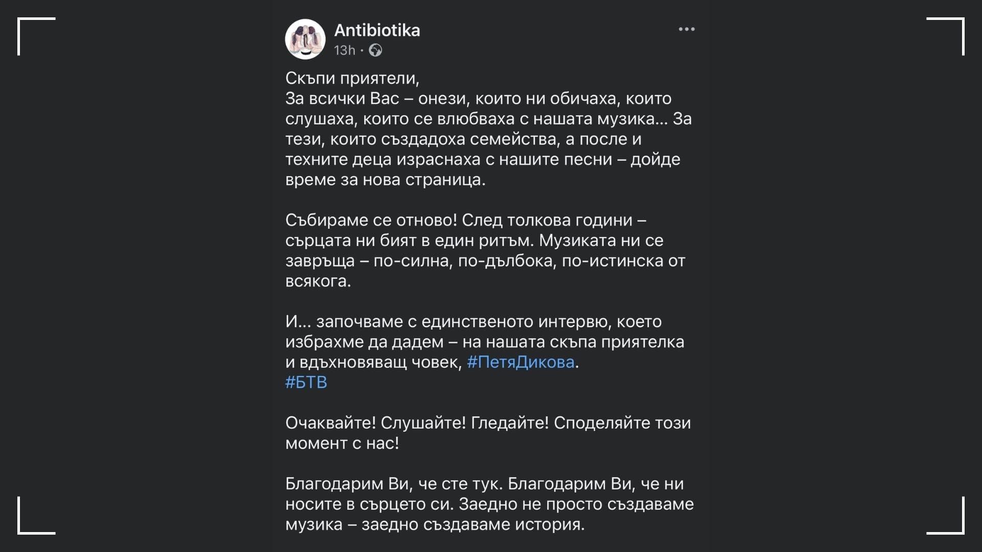 Съобщението дойде с приповдигнат тон, много емоции и едно категорично изречение: „започваме с единственото интервю, което избрахме да дадем“. Когато се завръщаш след толкова дълго отсъствие, не можеш да очакваш сцената да е замръзнала и да те чака. Светът е различен. Публиката – също. Ако искаш интерес, трябва да го предизвикаш, а не да го заявиш. Разкажи защо се връщаш. Покажи какво носиш сега, не какво си оставила тогава. Не се започва с ултиматуми. Започва се с истинско присъствие.